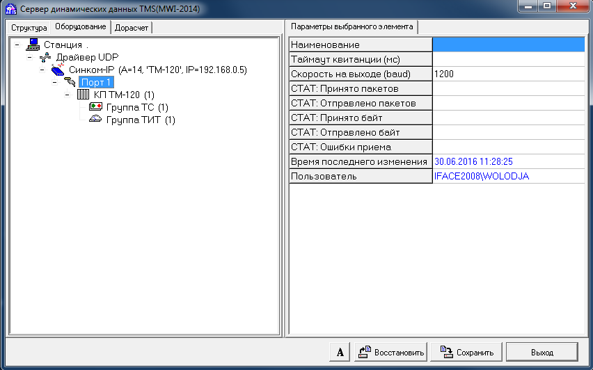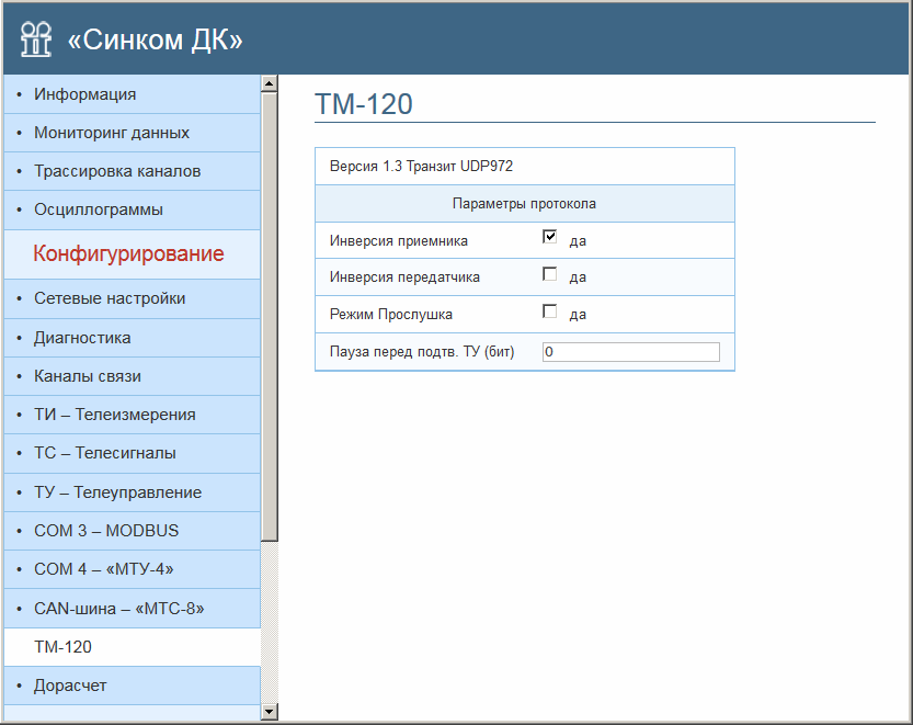 Параметры настройки протокола - «Инверсия приемника», «Инверсия передатчика», «Режим - прослушка» выбираются индивидуально с учетом настроек КП «ТМ-120». Данные, полученные через порт СОМ1, контроллер транзитом ретранслирует на порт Ethernet – UDP 972 без сохранения их в памяти контроллера.