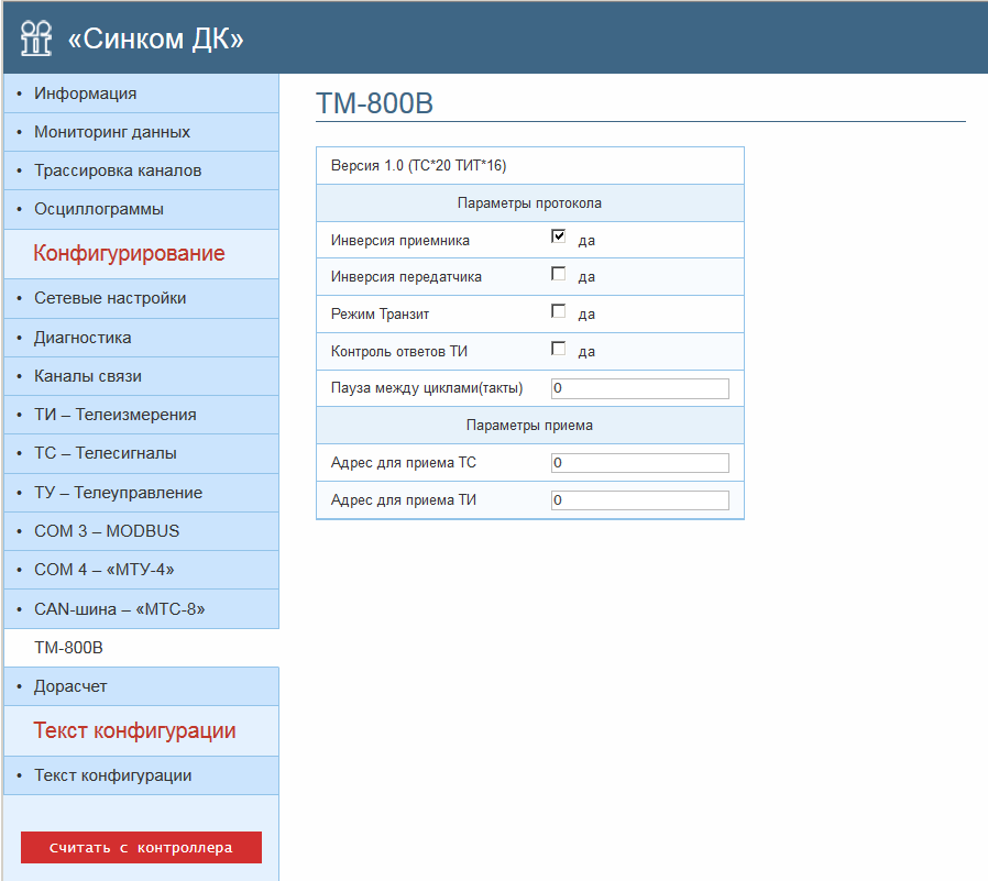 Закладка «ТМ-800В» меню Web-конфигуратора появляется вместо закладки «Спец режим» при прошивке в контроллер ПО из файла SinD_TM800b.hex и используется для настройки протокола обмена с КП «ТМ-800В» через порт СОМ1 контроллера.