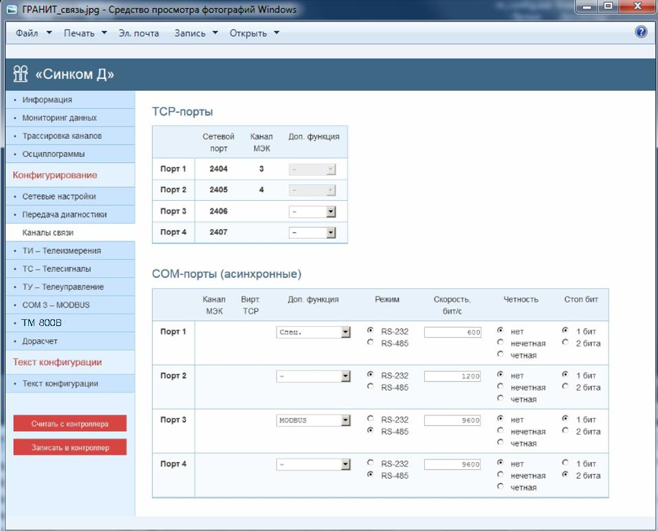 Прием данных от КП «ТМ-800В» выполняется в синхронном протоколе. Пример настроек порта СОМ1 контроллера:
