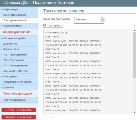 Вкладка «Трассировка каналов» позволяет сделать трассировку обмена по портам и шинам контроллера серии «Синком-Д». Также вкладка предназначена для системного мониторинга, просмотра системного журнала и журнала ТС.