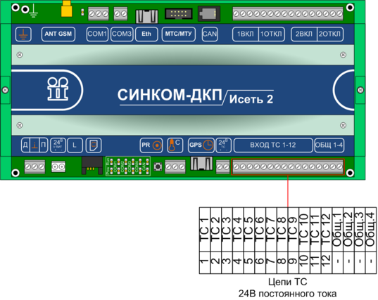 Внешние цепи ТС подключаются непосредственно к контроллерам «Синком-ДКП» и «Синком-ДКП»/13,8. Для подключения цепей ТС используются винтовые клеммы для проводов сечением до 2,5 мм