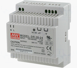 Блок питания DR30-24 построен по схеме с преобразованием напряжения на высокой частоте и предназначен для использования в щитовых устройствах. Обозначение блока питания размещено на боковой панели.