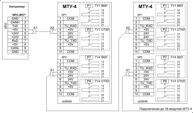 Модули «МТУ-4», соединённые последовательно, образуют кластер телеуправления. Размер кластера ограничен. К контроллеру можно подключить не более 16 модулей «МТУ-4» (до 25 модулей «МТУ-4» v.4 и выше с использованием
