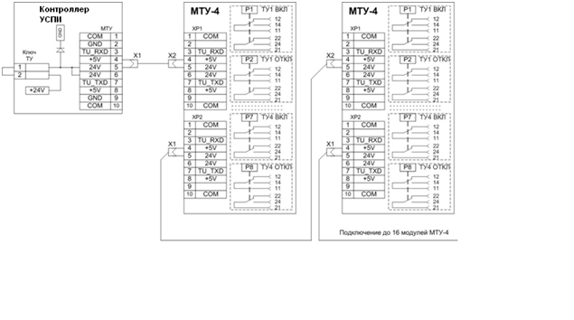 Для подключения модуля «МТУ-4» к контроллеру и соединения между модулями «МТУ-4» используется 10 жильный шлейф с разъемами IDC-10F с обеих сторон с разводкой жил кабеля «один в один».