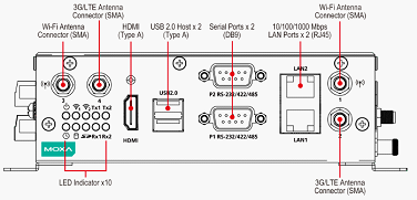 Внешний вид компьютера MOXA V2201-E2-T, расположение и назначение индикаторов и разъемов