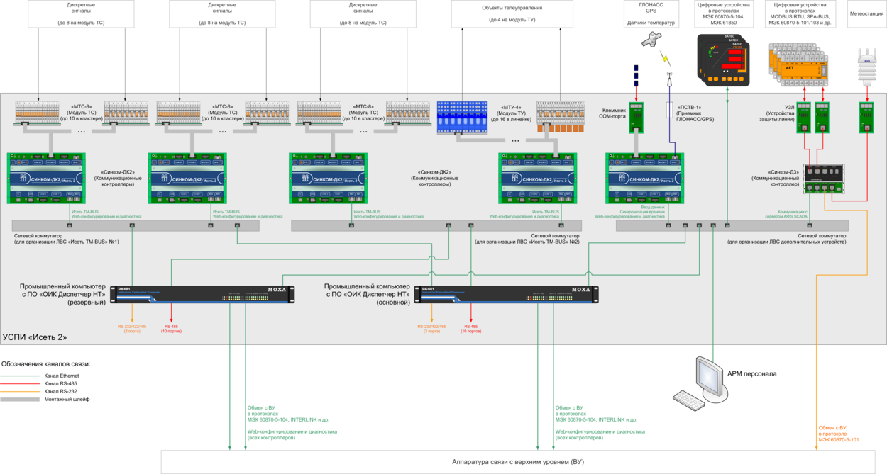 Структурная схема УСПИ с резервированием серверов, с двумя шинами «Исеть TM-BUS» (до 4000 ТС, до 2000 ТИ, до 1000 ТУ):