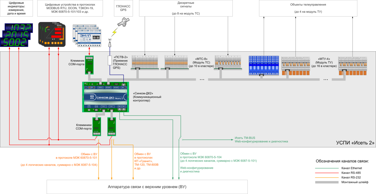 Для передачи данных на верхний уровень у контроллера УСПИ может быть задействован произвольный порт Ethernet, порт GPRS (передача данных с использованием протокола МЭК 60870-5-104) и/или произвольный асинхронный порт (передача данных с использованием протокола МЭК 60870-5-101).